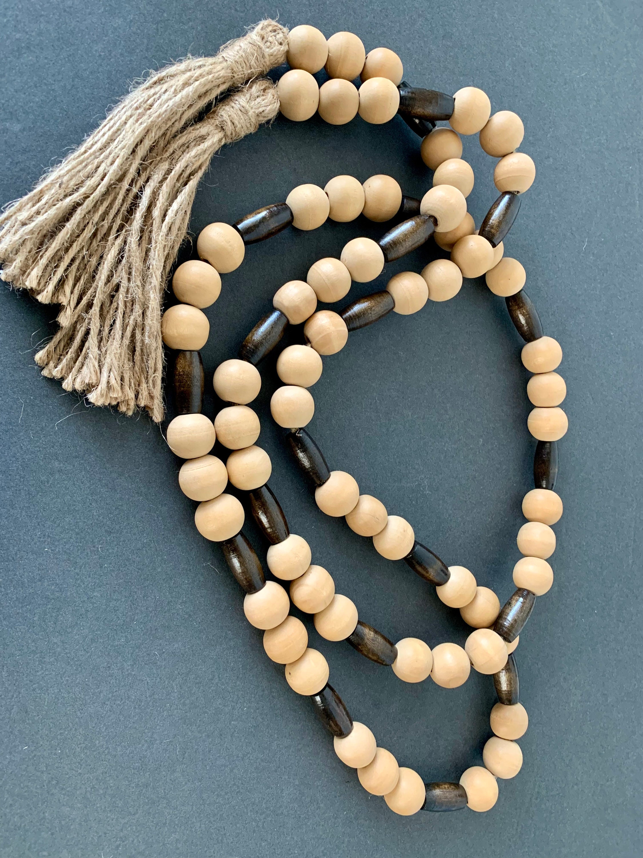 The beads are natural brown & dark walnut in color with jute tassels at each end.