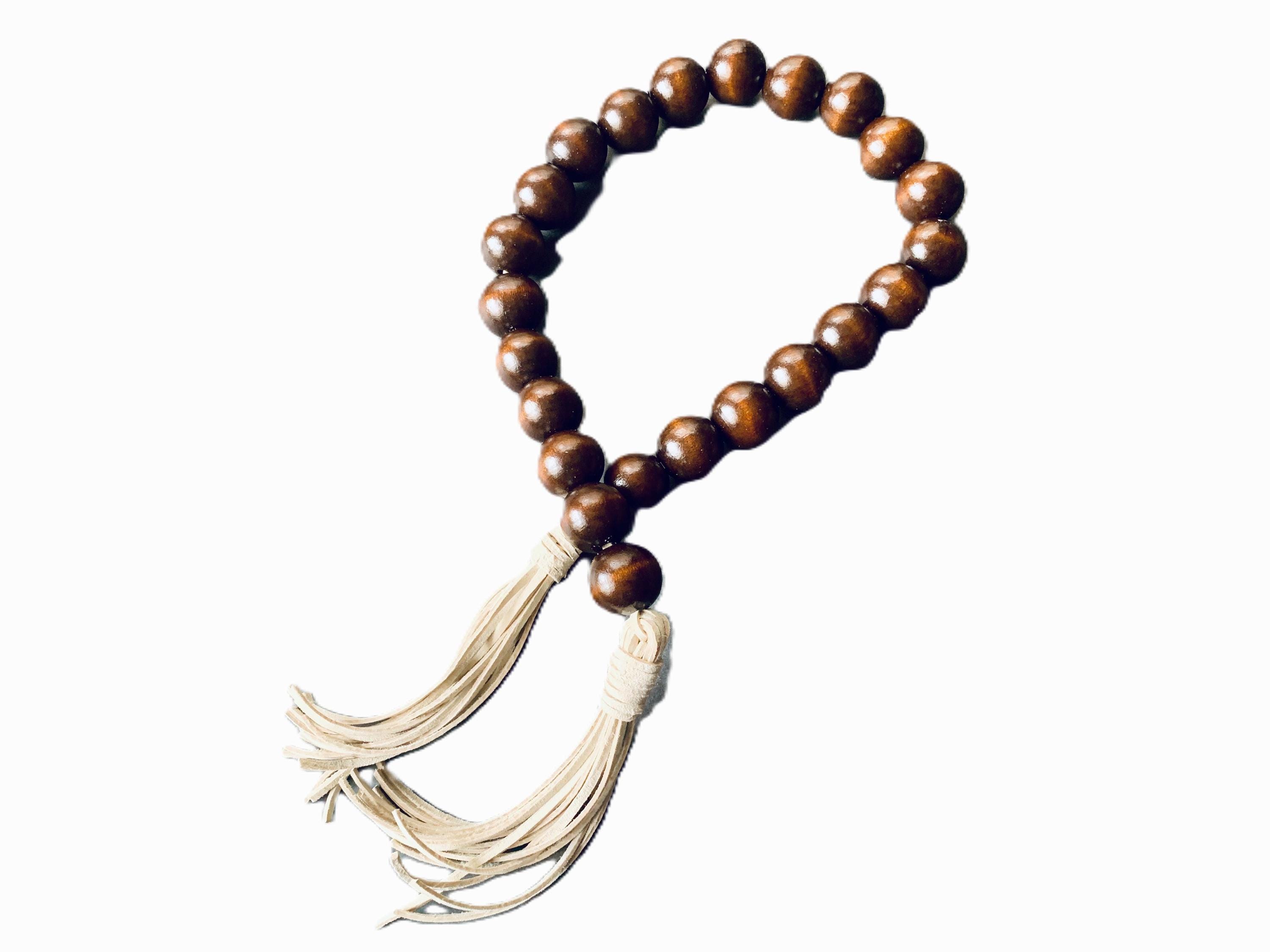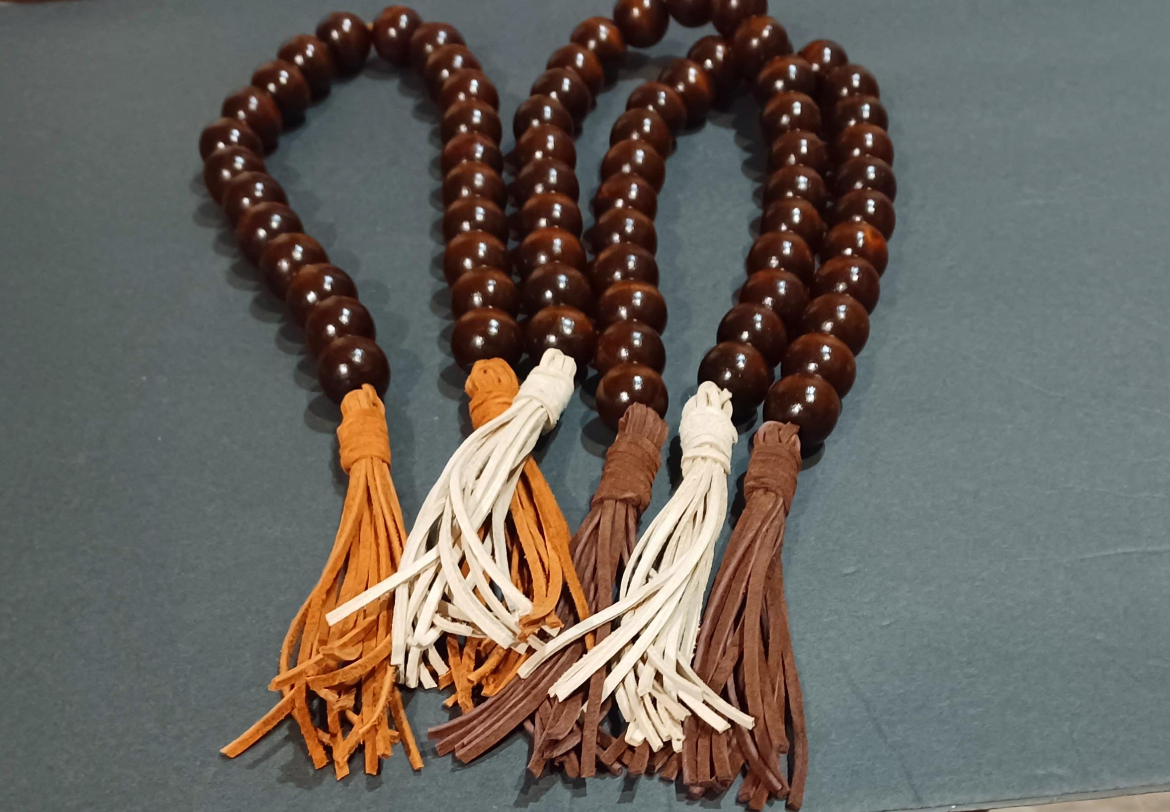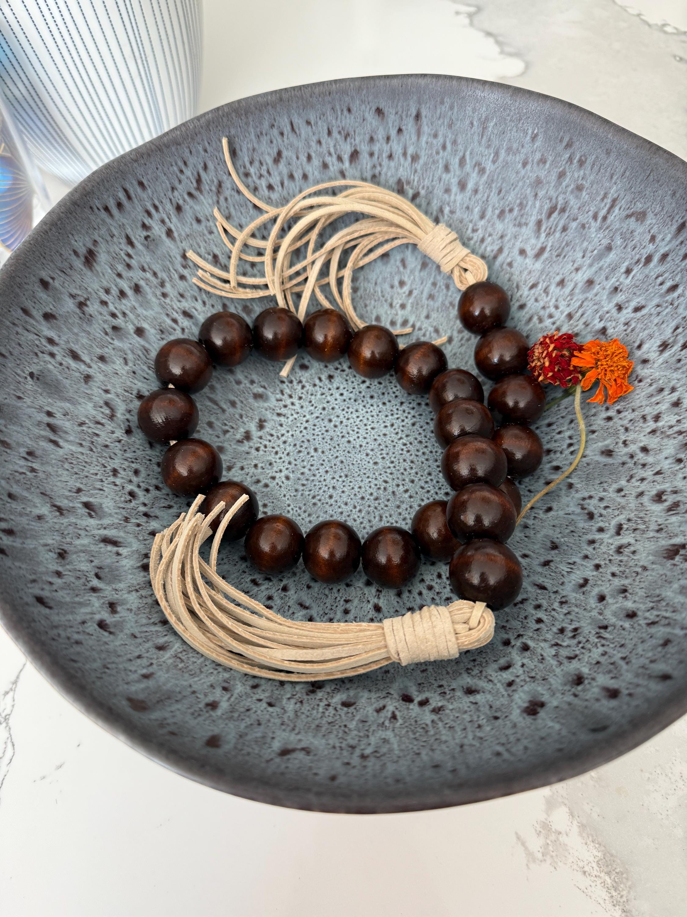 Spruce up any room with the Mahogany Wood Beaded Garland with Ivory Leather Tassels. The garland is a great addition to any table, fireplace, shelf or tray. The best part of this gem is however you decide to style this garland will be lovely!