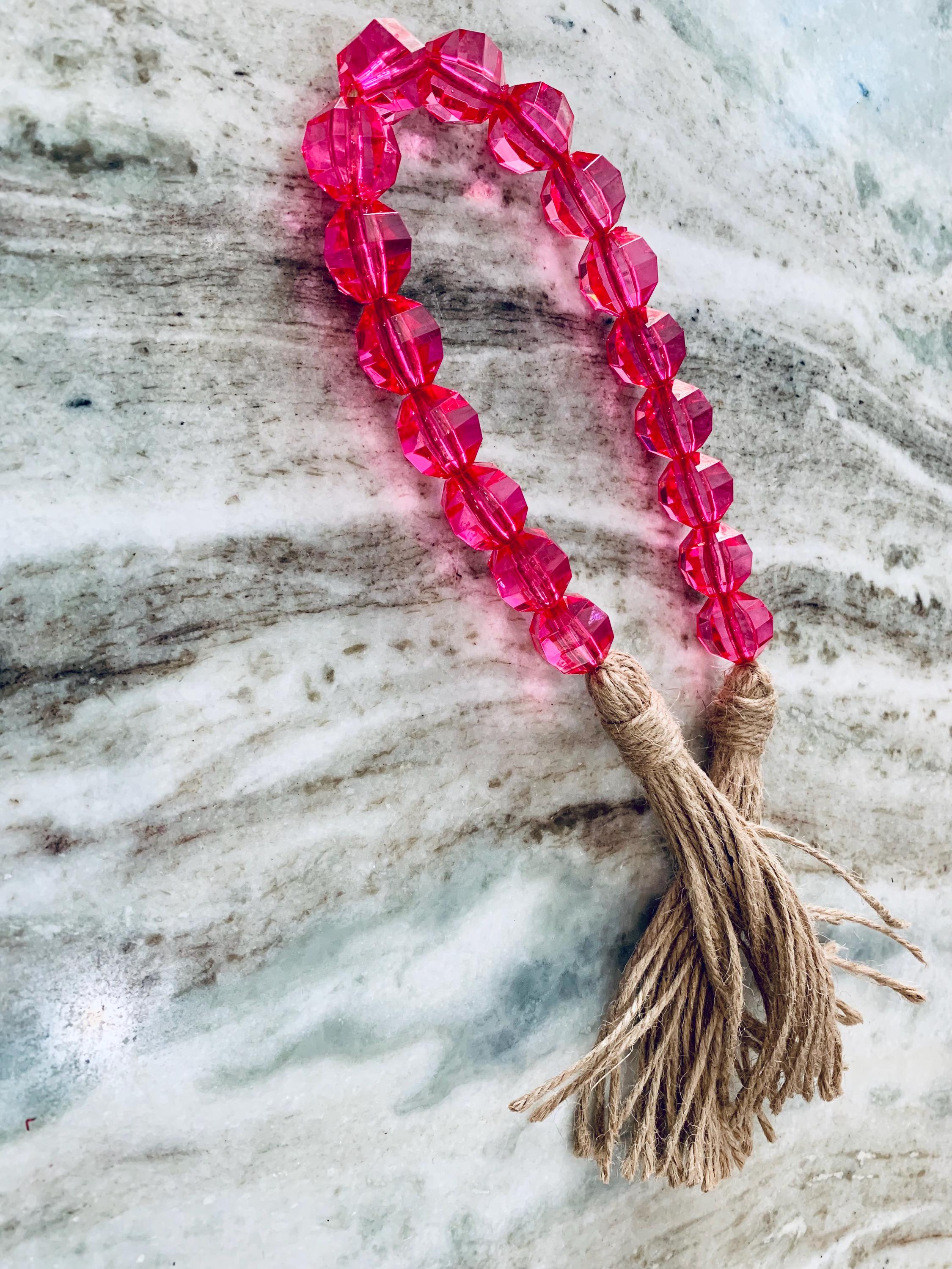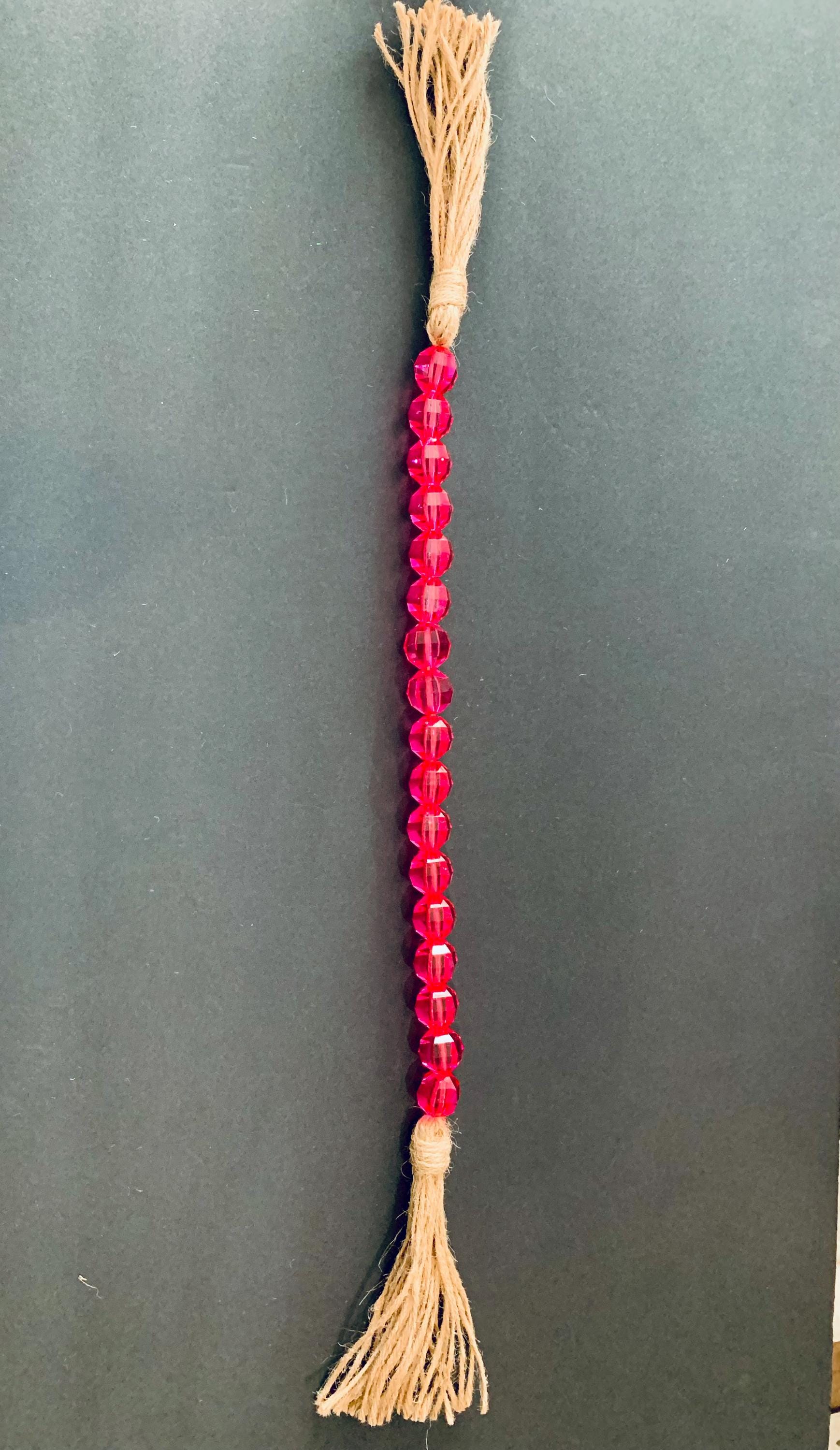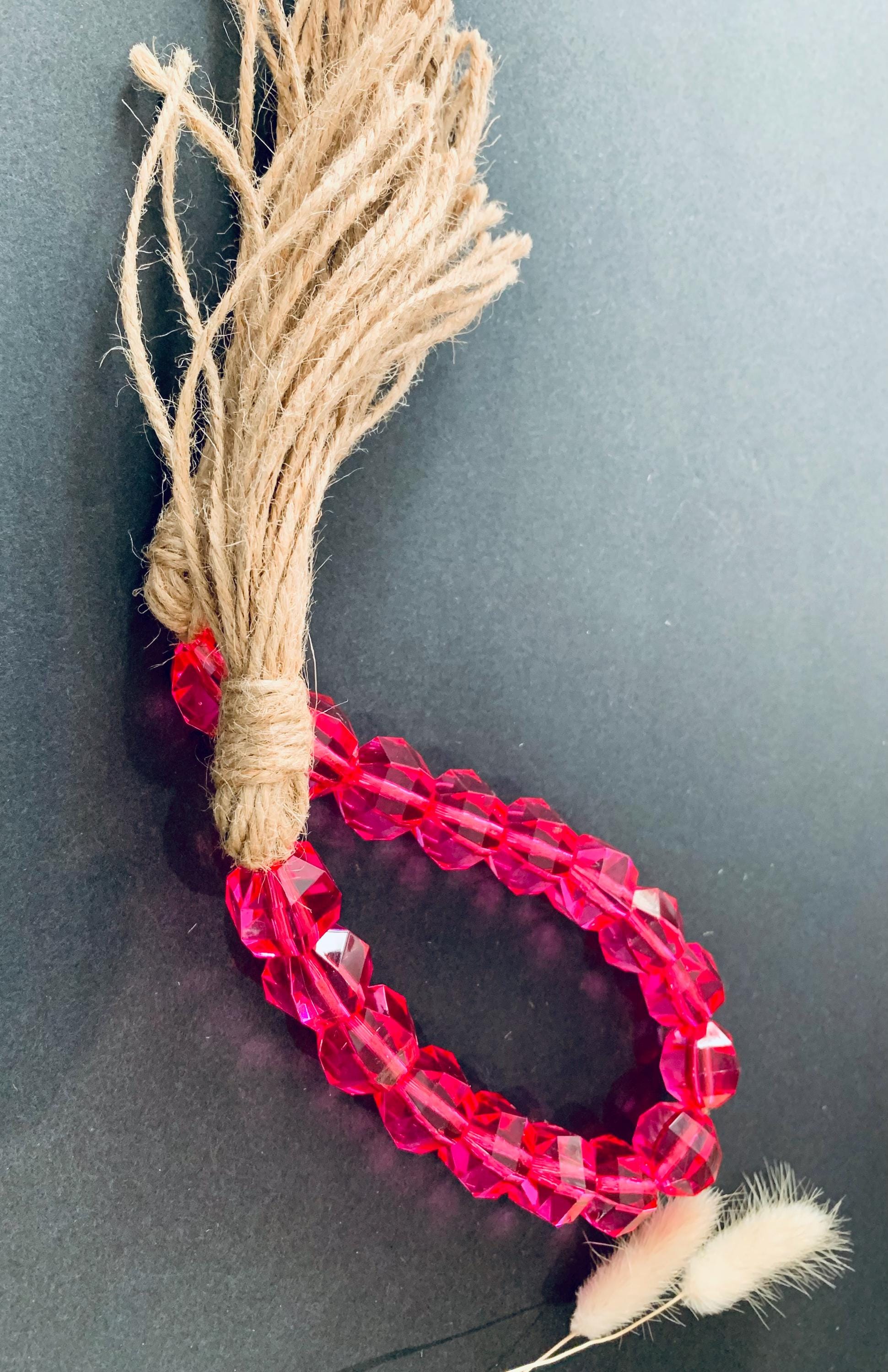 Add a touch of charm to your space with the Pink Faceted Bead Garland with Jute Tassels! This beautifully crafted garland features stunning pink faceted beads that catch the light perfectly, combined with rustic jute tassels for a cozy, bohemian vibe. Ideal for enhancing your home decor, nursery, or party setup, it’s a versatile piece that fits any occasion. Hang it on walls, mantels, or use it for a unique photo backdrop. Elevate your decor effortlessly with this delightful garland!