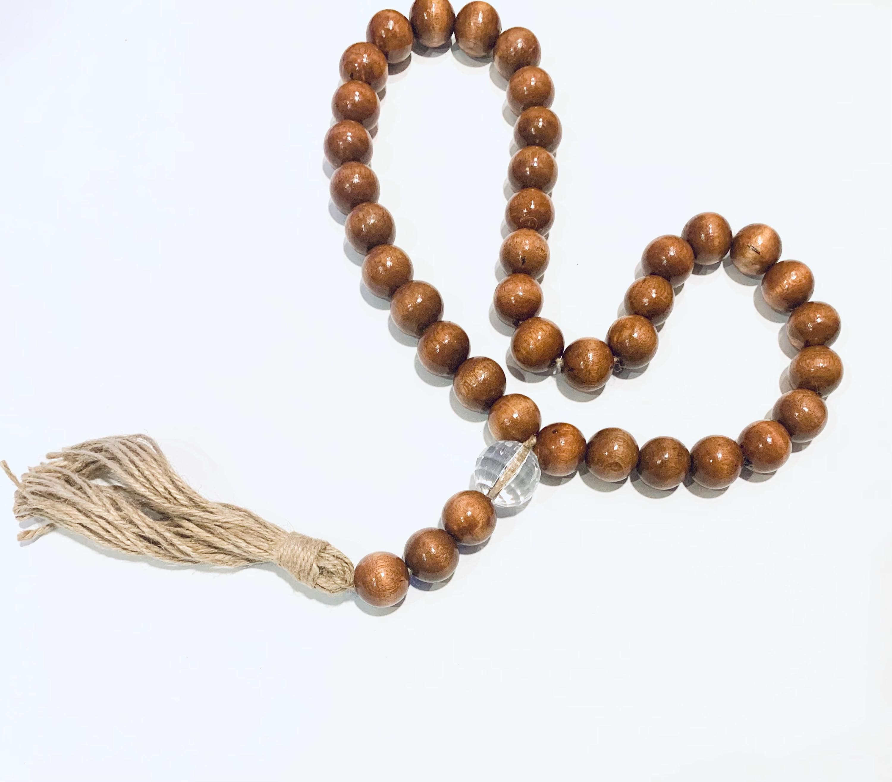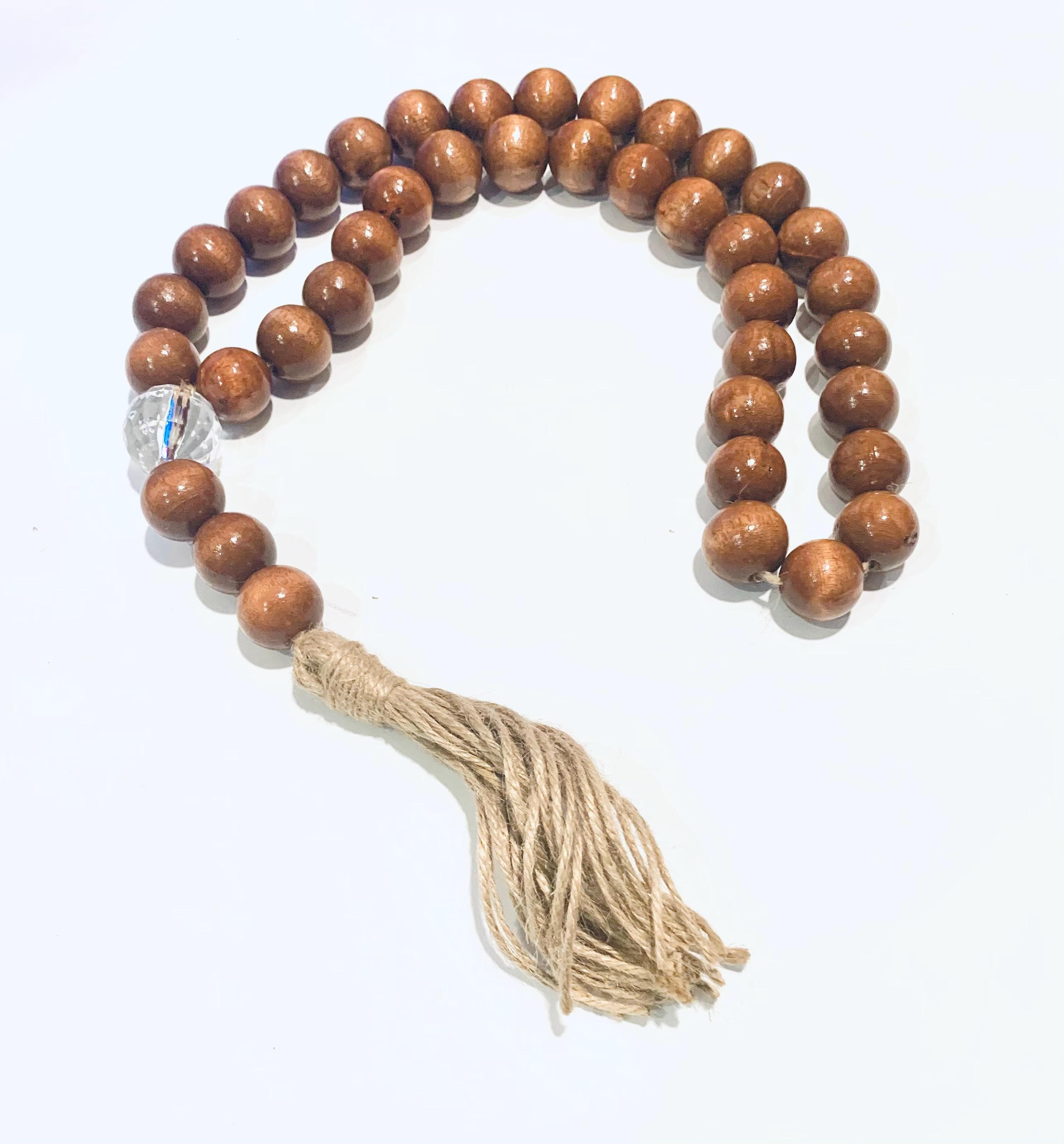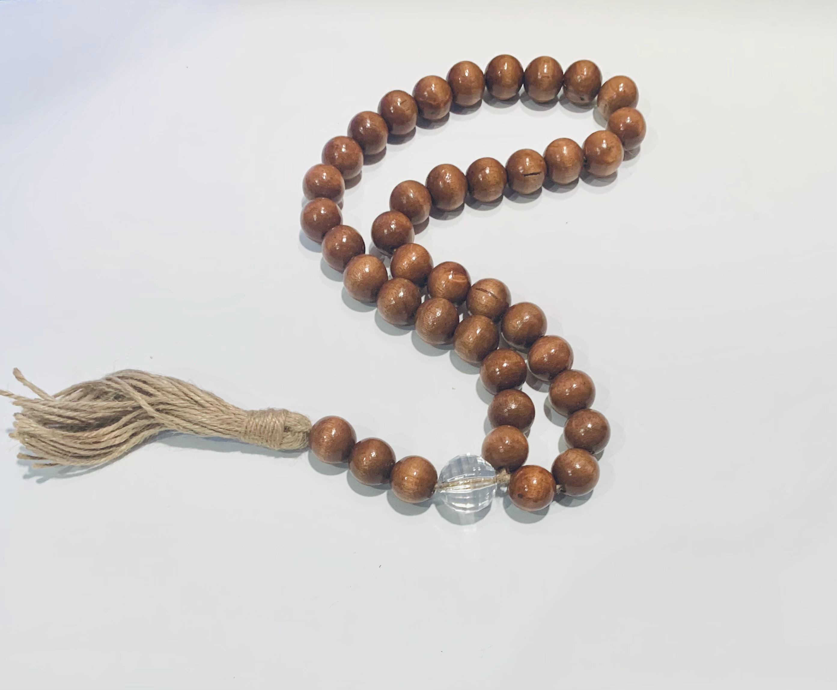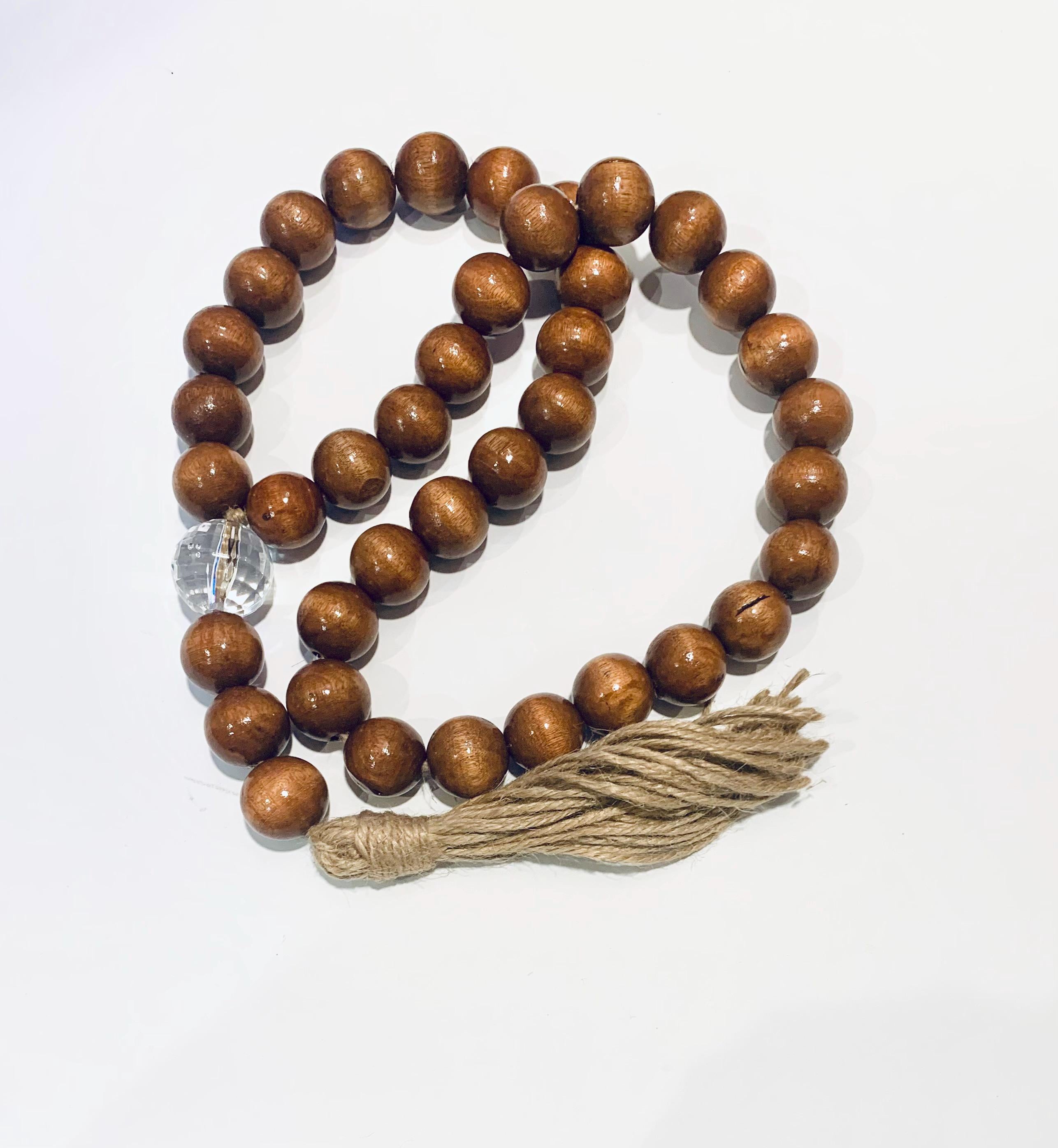 - Containing a crystal faceted and wood beads with a jute tassel