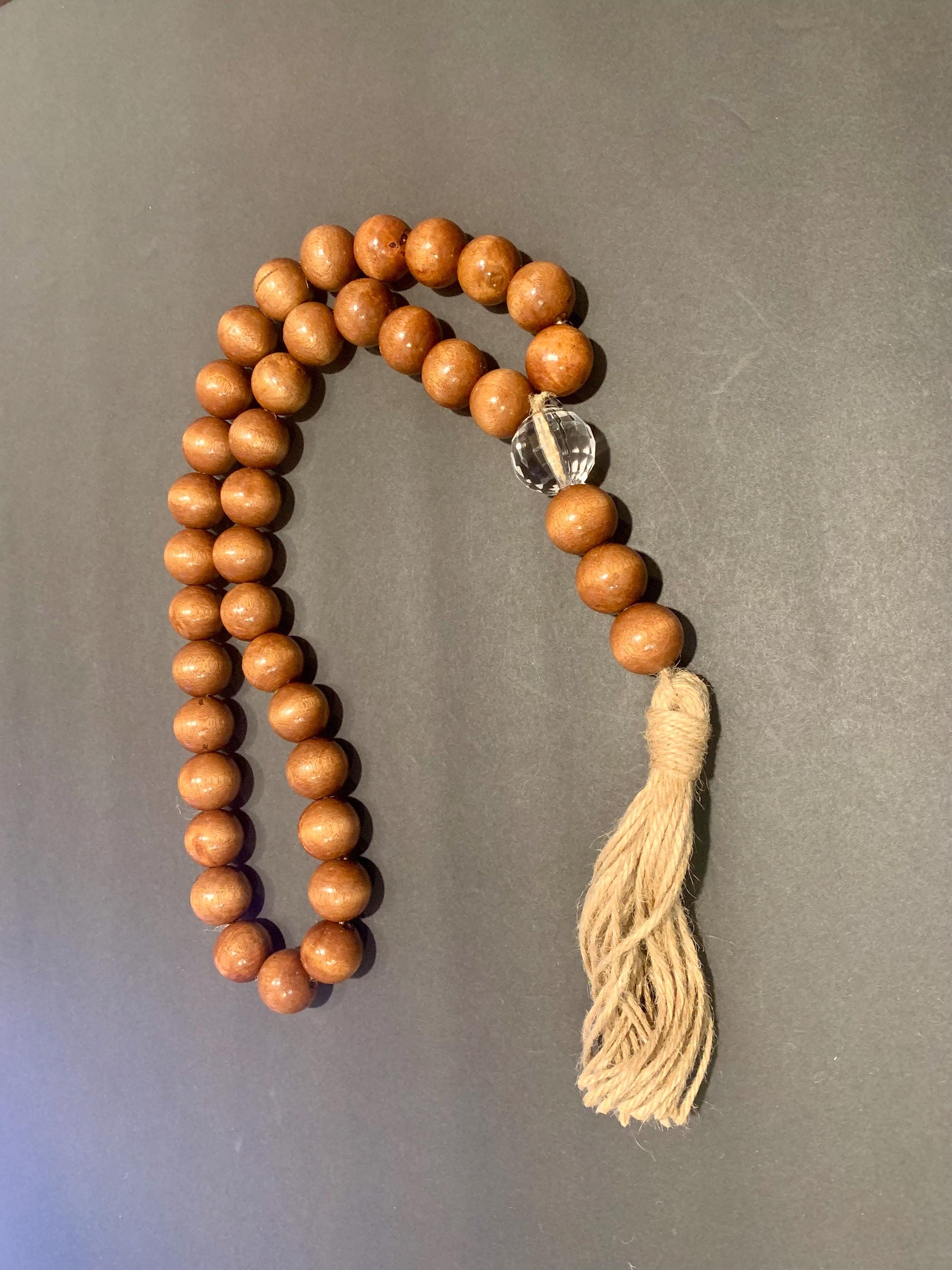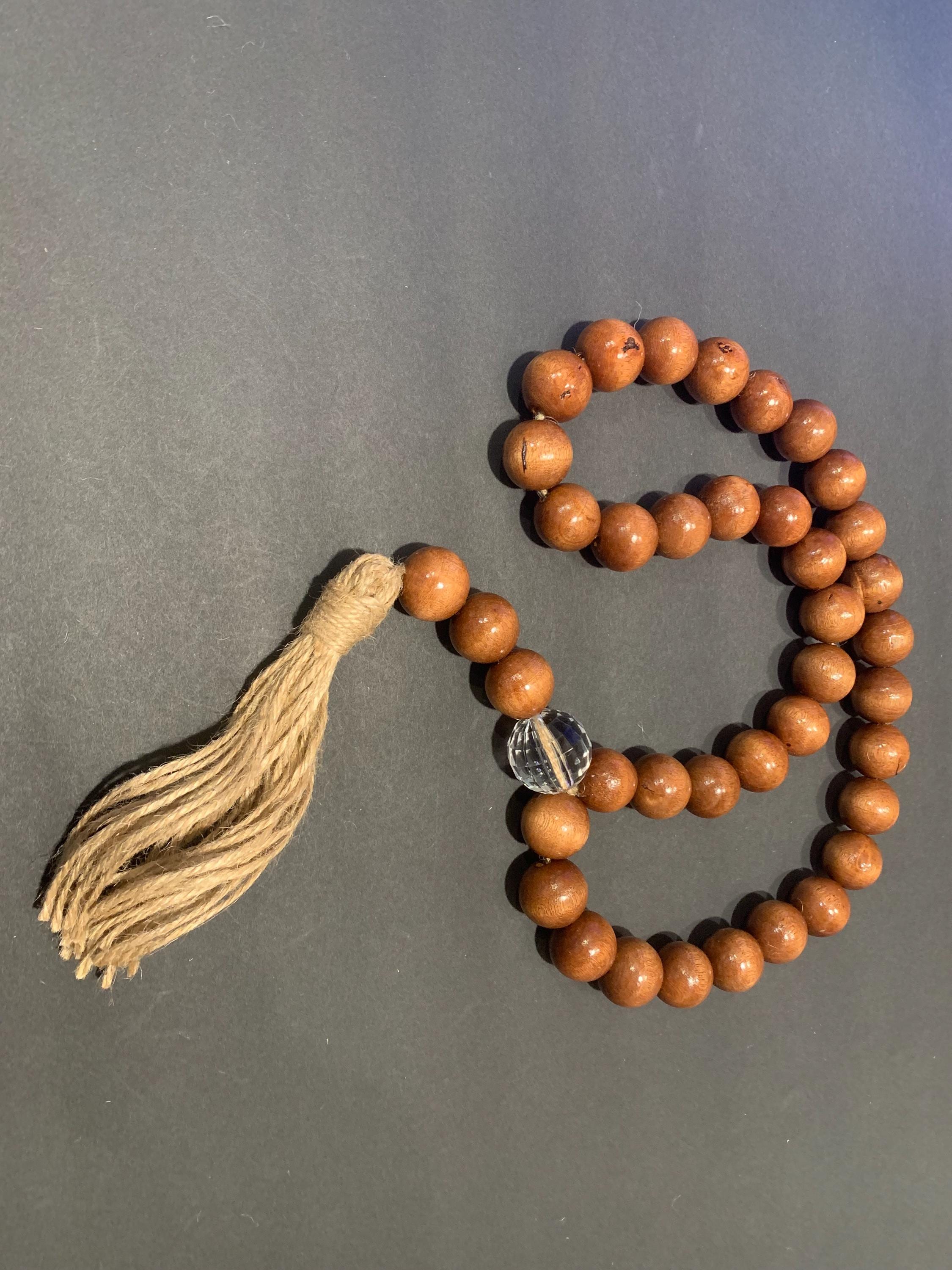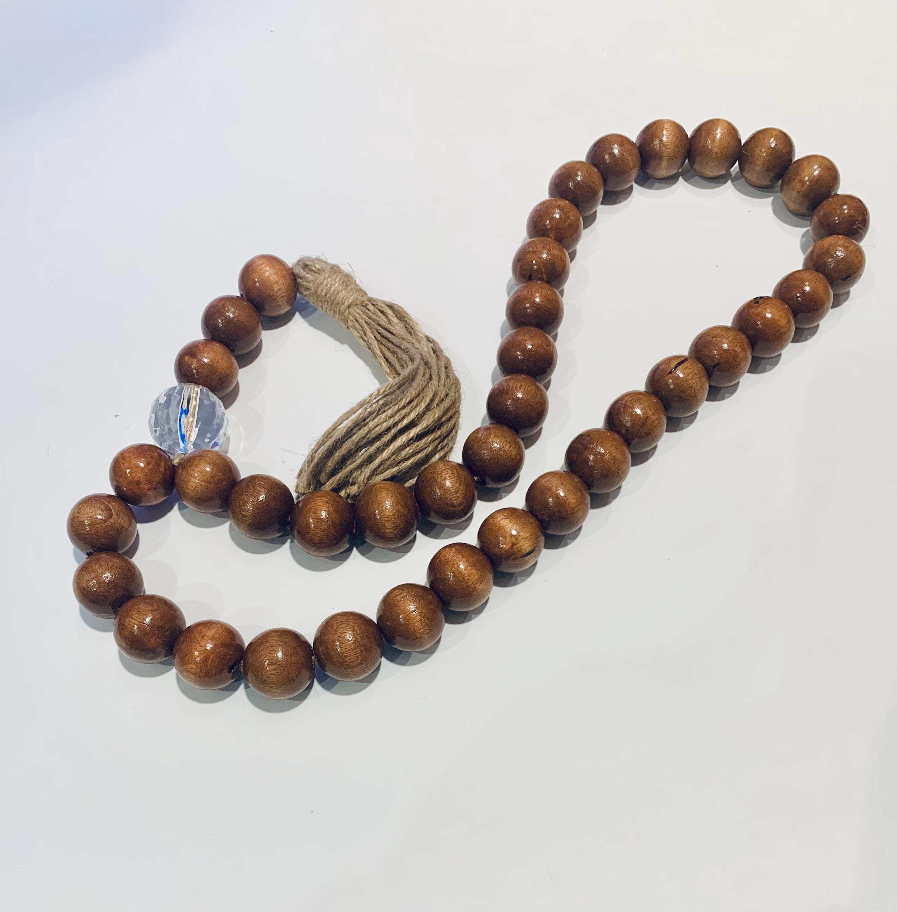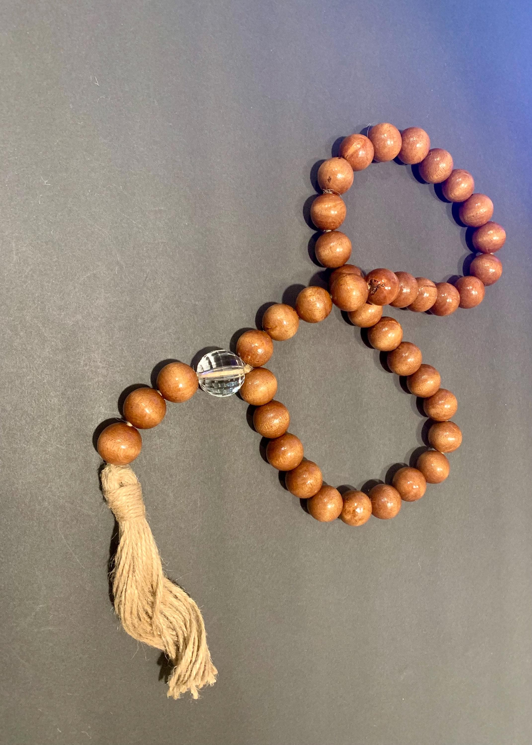 - Containing a crystal faceted and wood beads with a jute tassel