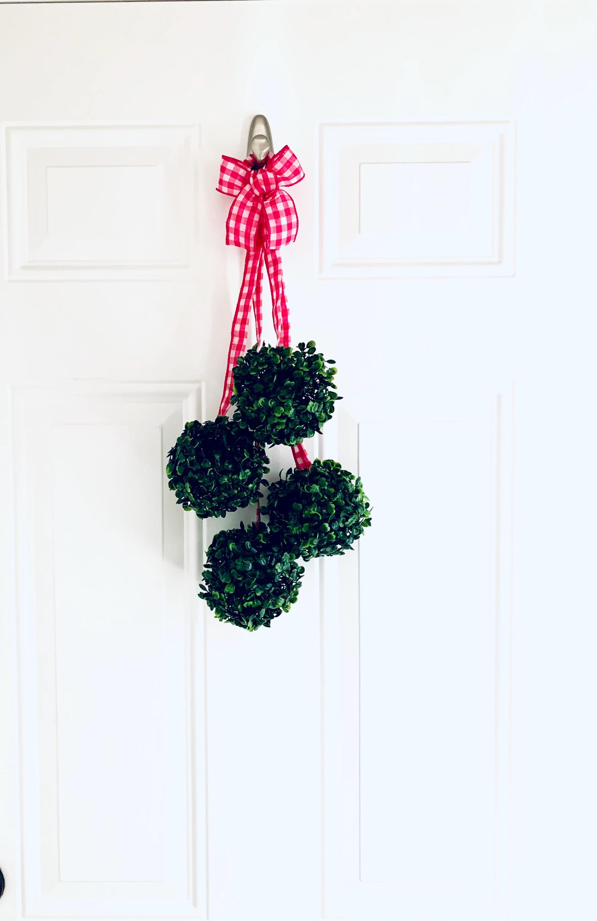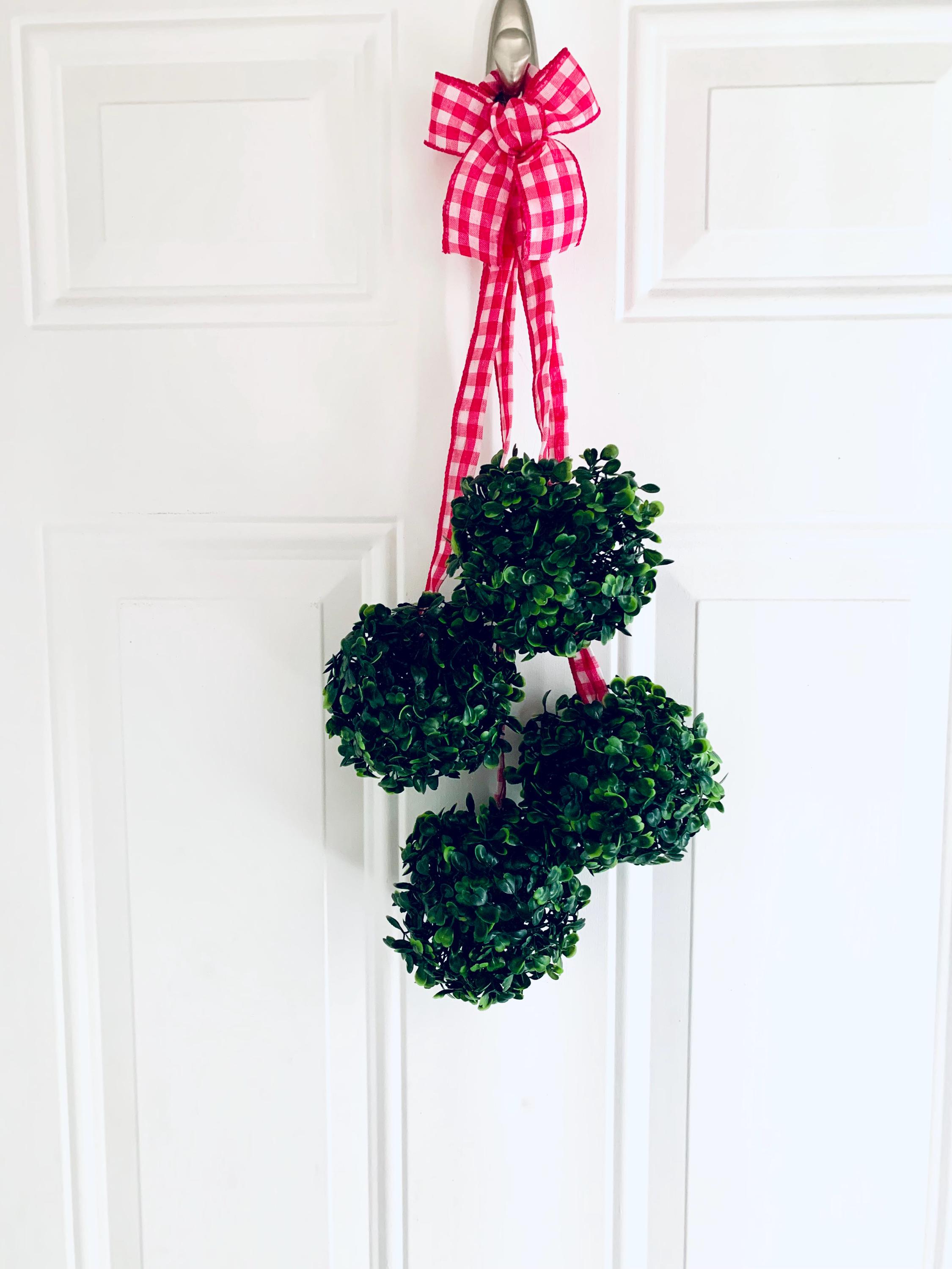 The greenery spheres are hanging from pink and white gingham ribbon.