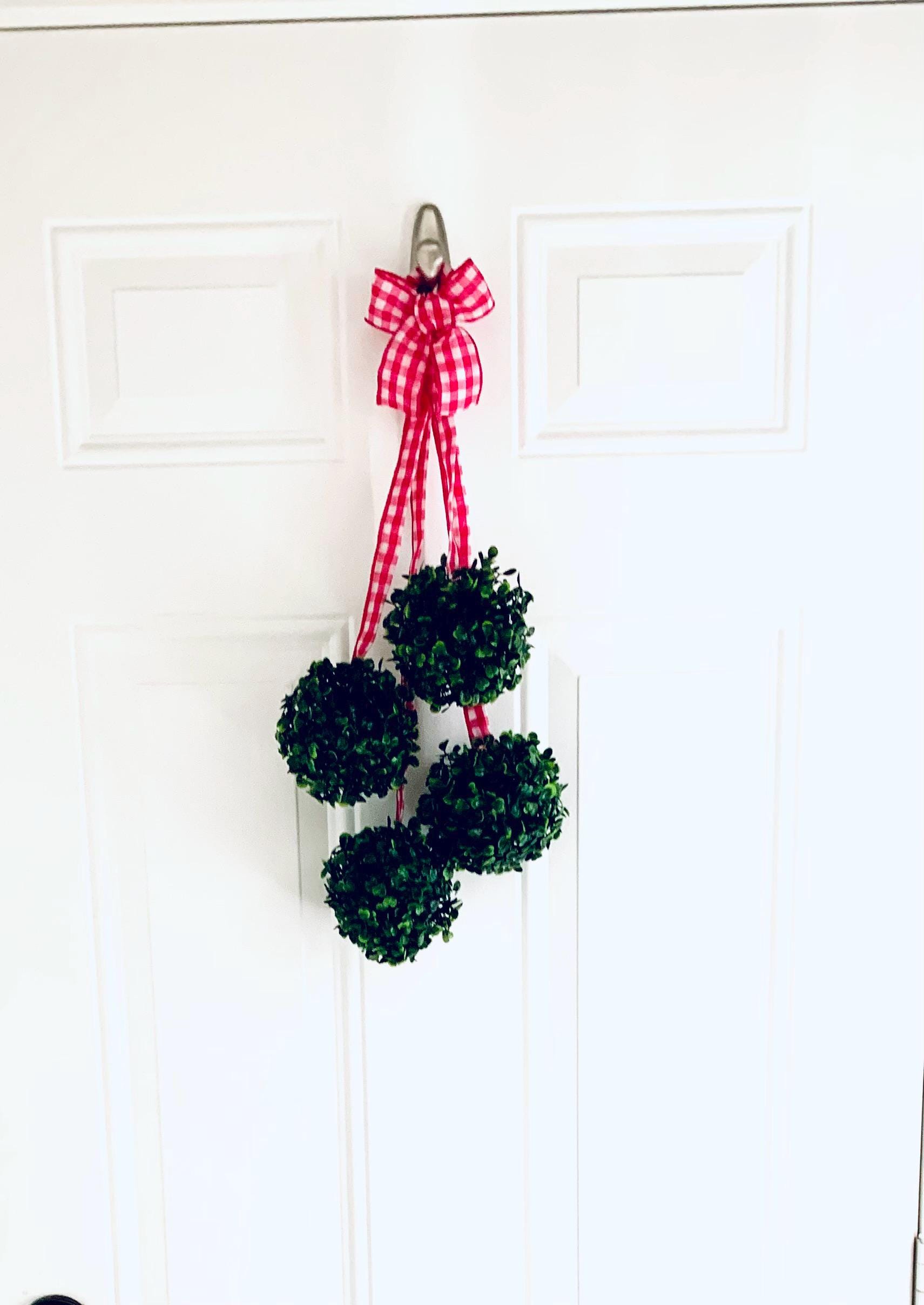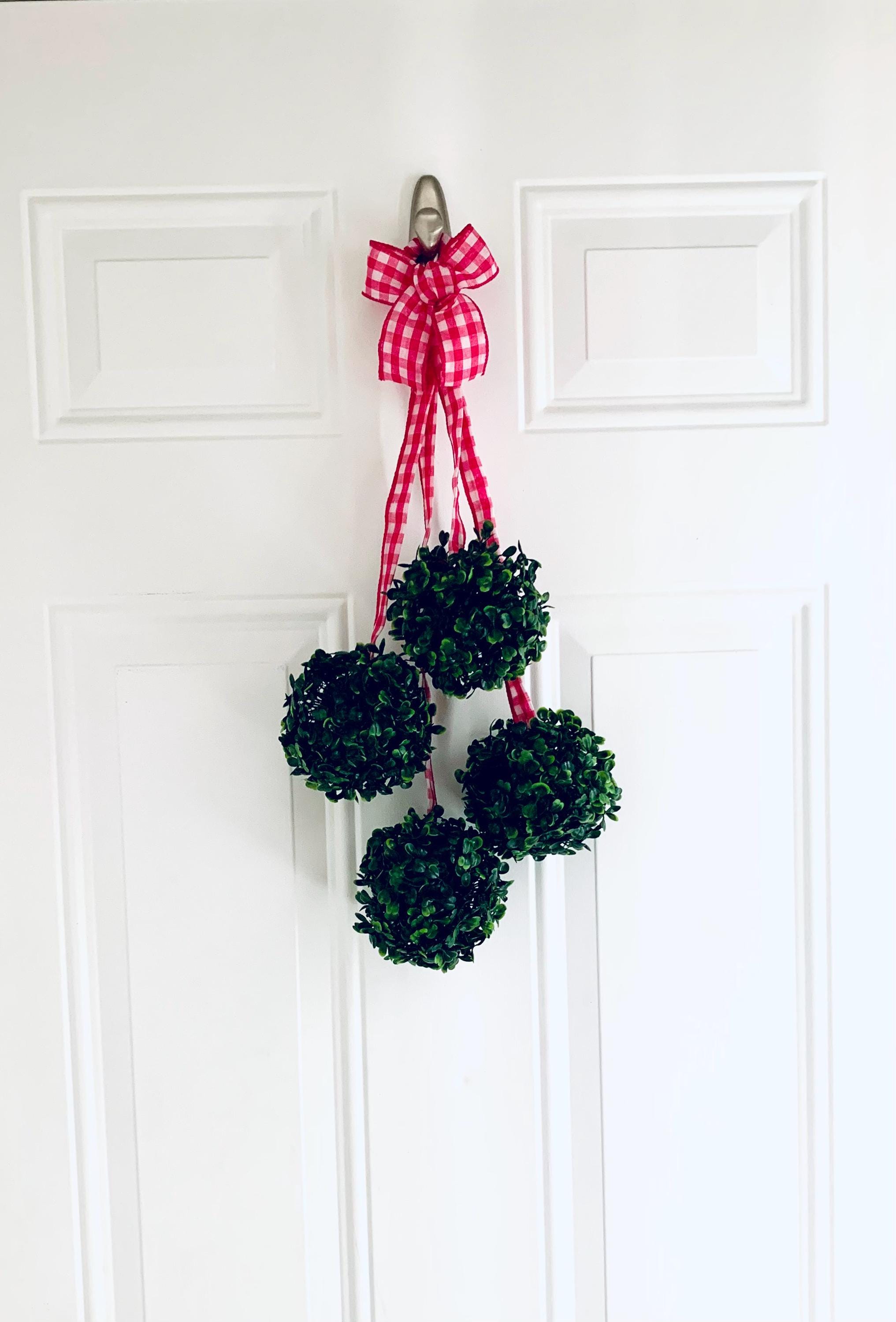 Welcome the beauty of nature into your home with the Greenery Spheres Door Hanger, adorned with a charming pink and white gingham ribbon accent. Perfect for adding a refreshing touch to your front door, this delightful piece combines lush greenery with a playful pop of color. Ideal for any season, it makes a lovely statement for your entryway. Bring warmth and cheer to your home decor with this unique and inviting door hanger! Perfect for gifting or sprucing up your own space.